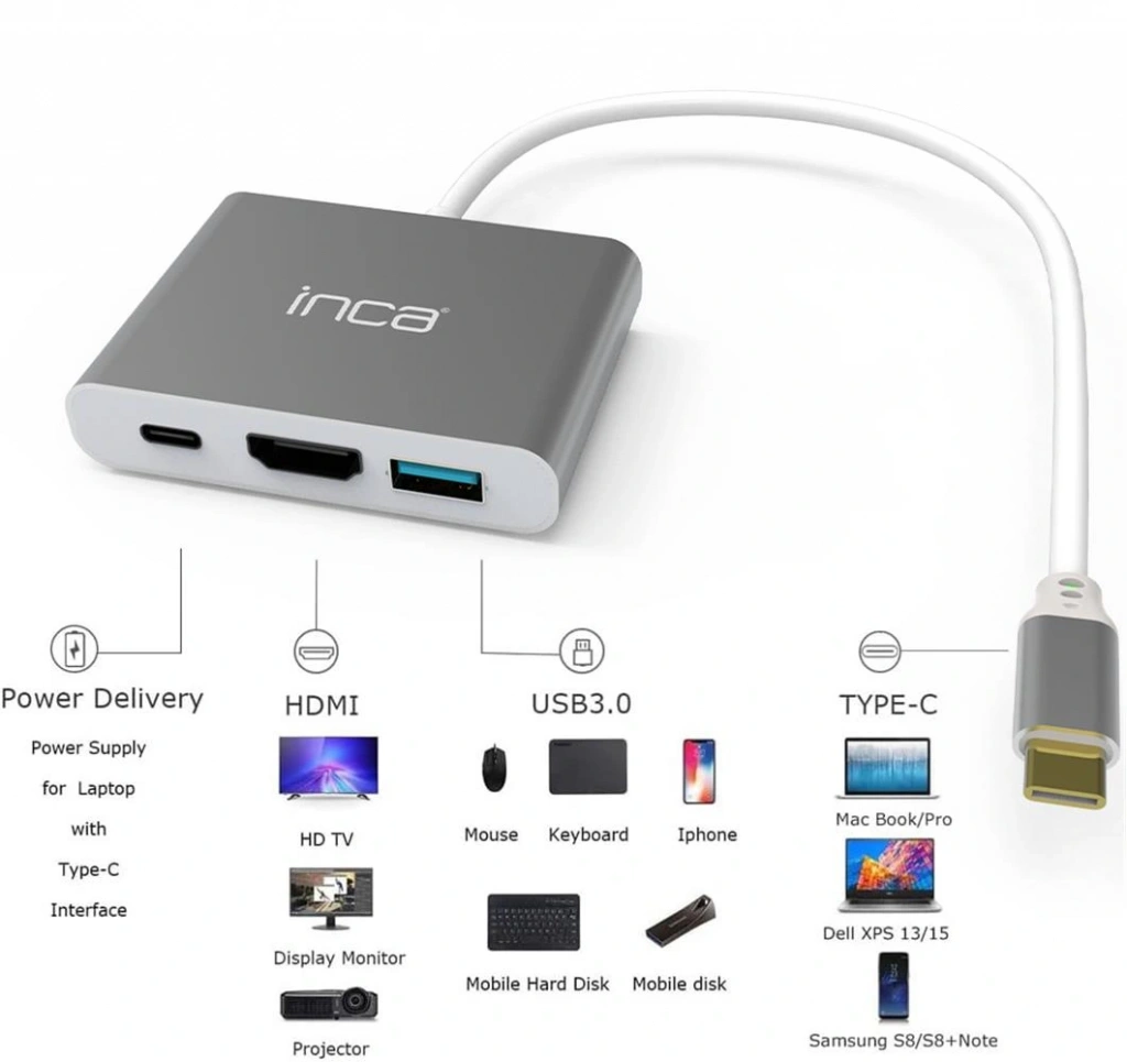Inca ITPC-04TX Type-c Hub HDMI 4K@30hz USB3.0+PD100W Akım ve Voltaj Korumalı Alüminyum Çoklayıcı